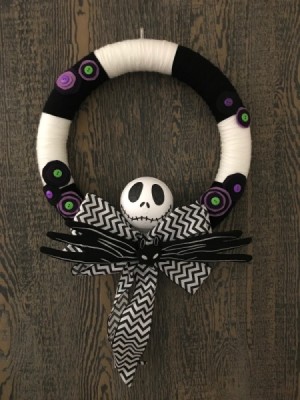 I made the Nightmare Before Christmas wreath and received so many compliments! Thank you! I dont sew much and was short on time so made some felt stacked flowers.