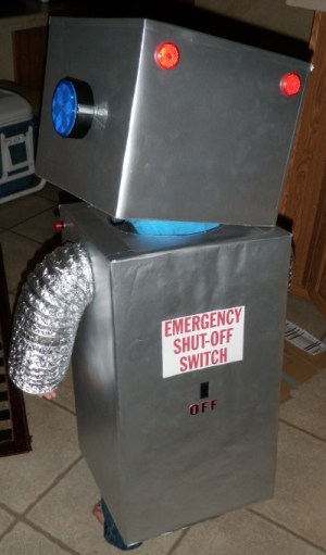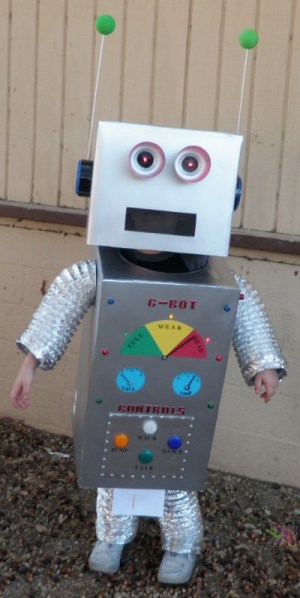 Excellent costume --I love your creativity! My only concern is how well your little mechanical friend can see while trick-or-treating in the dark . . . but I assume a grown up will be with him (?her?). Big thumbs up!