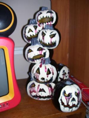 Recycle your old faded plastic pumpkins with a new coat of paint and a little glitter. Acrylic paint works best for indoor and outdoor use.